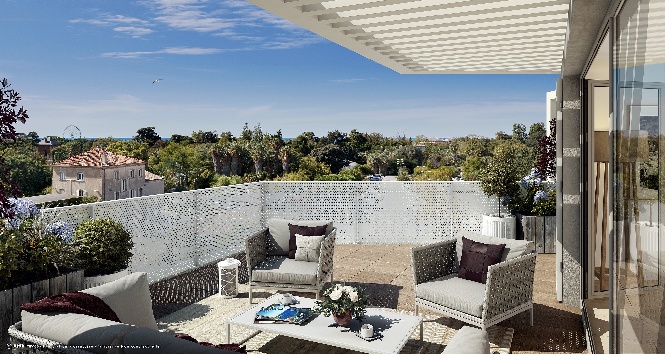 L’écriture architecturale privilégie la sobriété et la lumière : façades claires, garde-corps filants, volumétries découpées en attique pour allier intimité et élégance contemporaine. Chaque logement bénéficie d’un extérieur généreux – jardin privatif, balcon ou terrasse – et d’une double orientation qui favorise la ventilation naturelle et le confort de vie.